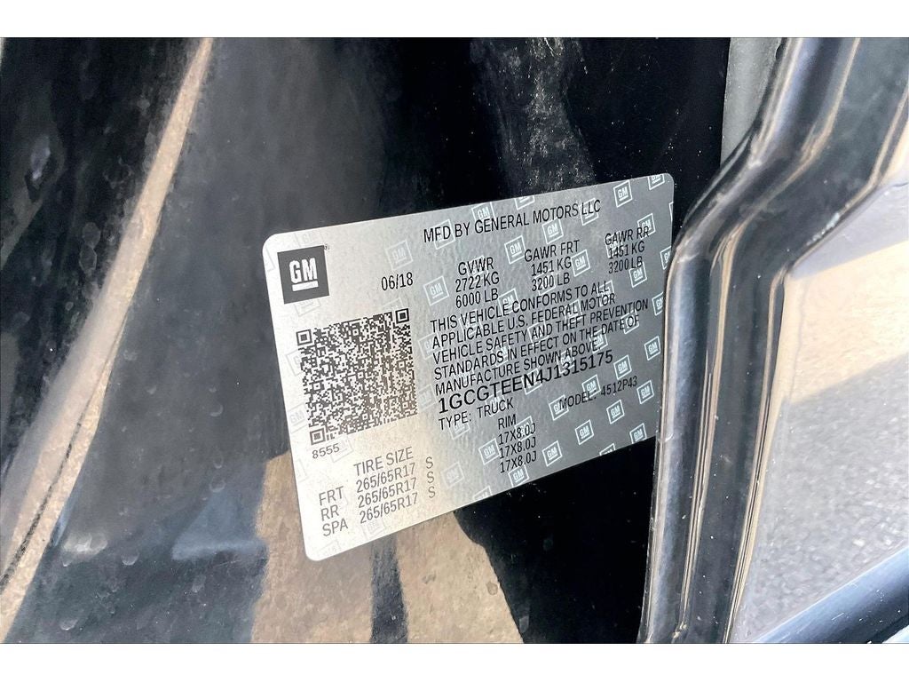Preferred Equipment Group 4ZR: Driver-Selectable Full-Locking Front Differential; 265/65R17 AT BW Spare Tire; Driver-Selectable Full-Locking Rear Differential; Off-Road Rocker Protection; 3.42 Rear Axle Ratio; Black Spray-On Bedliner with Chevrolet Logo; Transfer Case Shield; 17" X 8" Aluminum Spare Wheel; Integrated Trailer Brake Controller; Black Rear Bumpers; 17" X 8" Aluminum Wheels; 2-Speed Autotrac Electric Transfer Case; Heavy-Duty Trailering Package; 265/65R17 AT BW Tires; Off-Road Appearance Package; 3.6L DI DOHC V6 VVT Engine. Bose Premium 7-Speaker Audio System Feature. AM/FM Stereo with 8" Diagonal Color Touch Navigation. Black Bowtie Emblem Package. Front License Plate Kit. **Equipment listed is based on original vehicle build and subject to change. Please confirm the accuracy of the included equipment by calling the dealer prior to purchase.**