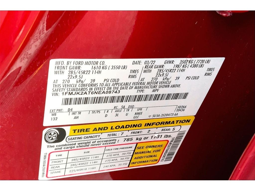 Equipment Group 304A Stealth Performance Package: 3.73 Axle Ratio; 1st and 2nd Row Floor Mats with Logo; Heated/ventilated Leather Front Captain's Chairs; .3.5L ECOBOOST V6 ENGINE; 22" Premium Black-Painted Aluminum Wheels; 7. 550 lbs GVWR; P285/45R22 110H AS BSW Tires; B&O Unleashed Sound System by Bang & Olufsen Radio. Ford Co-Pilot360 Assist 2.0: Reverse Brake Assist; 360-Degree Camera with Split View; Active Park Assist 2.0. Stealth Performance Edition Package: Sport Center Console; Black Roof Rack Side Rails; Black Limited Tailgate Badge; LED Taillamp with Black Bezels; Black Headlamp and Fog Lamp Bezels; Expedition Lettering on Hood; Ebony Black Twin Spar Grille; Ebony Black Tailgate Applique; Enhanced Active Noise Control; Body Color Door Handles; Power-Folding Sideview Mirrors with Autofold; Stealth Signature Lighting Removal; Ebony Black Power Deployable Running Boards; CCD W/SPORT TUNING SUSP; Dual Exhaust System; Red Brake Calipers. Sport-Tuned Suspension. Heavy-Duty Trailer Tow Package. SYNC 4A with Enhanced Voice Recognition. Rapid Red Metallic TC. Advanced Cargo Manager. Reversible Cargo Mat. **Equipment listed is based on original vehicle build and subject to change. Please confirm the accuracy of the included equipment by calling the dealer prior to purchase.**