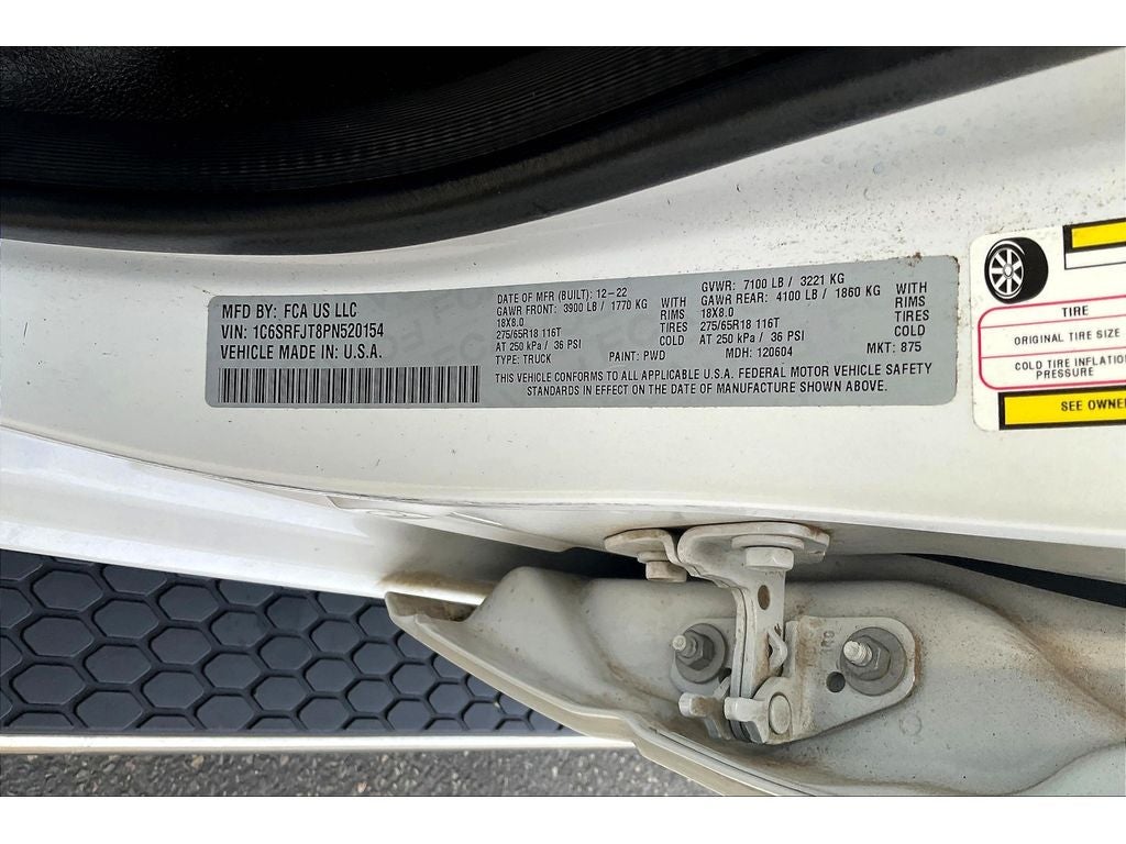 Laramie Level 1 Equipment Group: Google Android Auto; SiriusXM Radio Service; USB Host Flip; Rear Window Defroster; Blind Spot and Cross Path Detection; Rain Sensitive Windshield Wipers; Integrated Center Stack Radio; ParkSense Front/rear Park Assist with Stop; For Details. Visit DriveUconnect.com; For More Info. Call 800-643-2112; Rear Power Sliding Window; Integrated Voice Command with Bluetooth®; Connectivity - US/Canada; 12" Touchscreen Display; GPS Navigation; 4G LTE Wi-Fi Hot Spot; GPS Antenna Input; SiriusXM with 360L; Global Telematics Box Module; Connected Travel and Traffic Services; Front LED Fog Lamps; LED Reflector Headlamps; Foam Bottle Insert (door Trim Panel); Apple CarPlay; Disassociated Touchscreen Display; HD Radio; Remote Tailgate Release; Auto High Beam Headlamp Control; Electric Shift on Demand Transfer Case; Front Door Accent Lighting; 2nd Row in Floor Storage Bins; Rear Door Accent Lighting. Quick Order Package 27H Laramie. Leather Trimmed Bucket Seats. Ivory White Tri-Coat PC. ParkSense Front/rear Park Assist with Stop. Chrome Power-Fold Trailer Tow Mirrors. Class IV Receiver Hitch. Trailer Brake Control. MOPAR Front and Rear Rubber Floor Mats. **Equipment listed is based on original vehicle build and subject to change. Please confirm the accuracy of the included equipment by calling the dealer prior to purchase.**