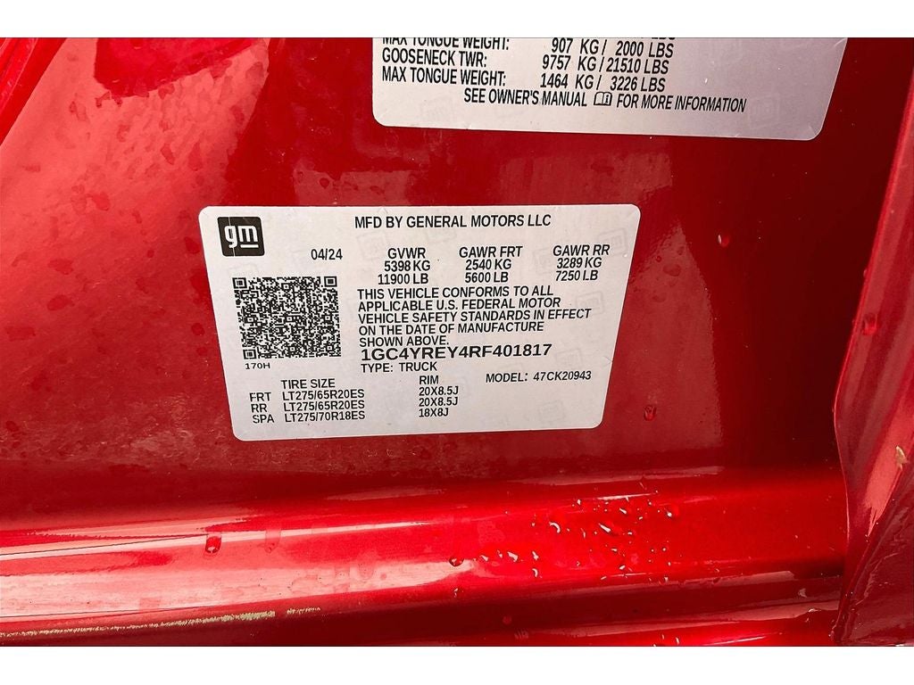 Dark Essentials Package: Black Name Plates; Front Black Bowtie Emblem; Black Tailgate Lettering. Max Trailering Package: 11. 900 lbs (5. 398 Kg) GVWR. High Country Premium Package: Power Sunroof; Gooseneck/5th Wheel Prep Package. Technology Package: 15" Diagonal Multicolor Head-Up Display; Rear Camera Mirror; Adaptive Cruise Control. Preferred Equipment Group 3LZ: Perforated Leather Seat Trim; SiriusXM with 360L; Power Sliding Rear Window with Defogger; Ultrasonic Front and Rear Park Assist; Trailer Camera Provisions; Electric Rear-Window Defogger; Unauthorized Entry Theft-Deterrent System; Front Rain-Sensing Wipers; Heated Steering Wheel; 120-Volt Interior Power Outlet; Wireless Charging; Front Bucket Seats; 20" 8-Spoke Polished Wheels; Color-Keyed Carpeting Floor Covering; OnStar and Chevrolet Connected Services Capable; Heated 2nd Row Outboard Seats; Power Front Windows with Passenger Express Up/down; Front Carpeted Floor Mats; Rear Carpeted Floor Mats; Chrome Mirror Caps; Power Rear Windows with Express Down; Manual Tilt and Telescoping Steering Column; Keyless Open and Start