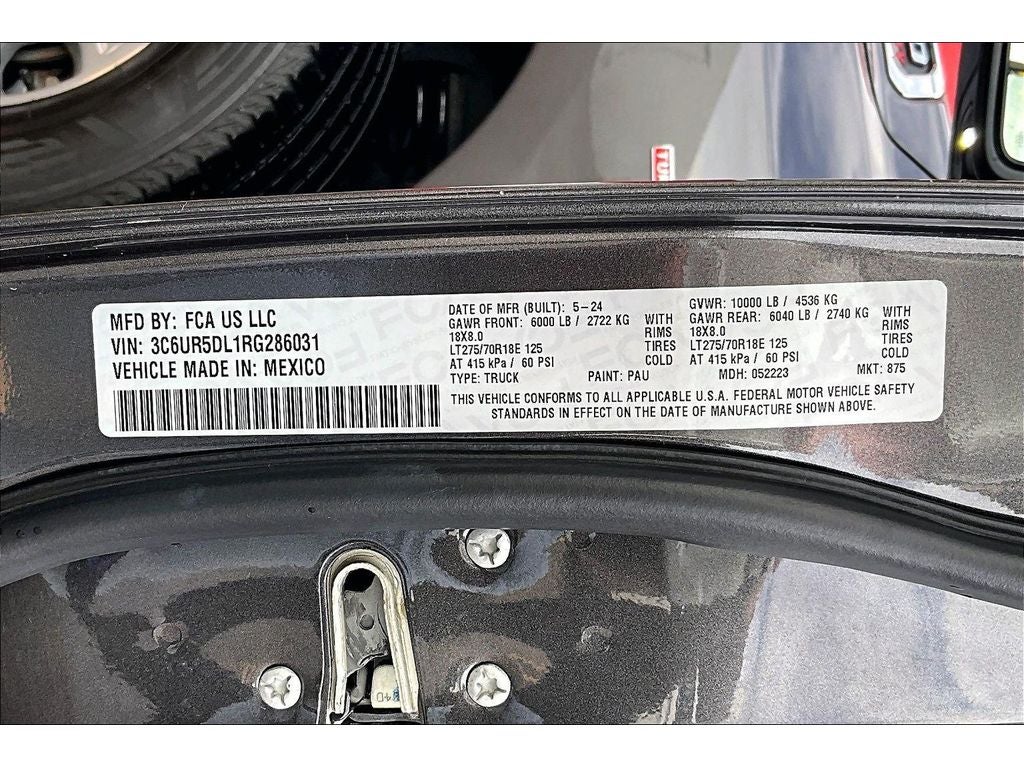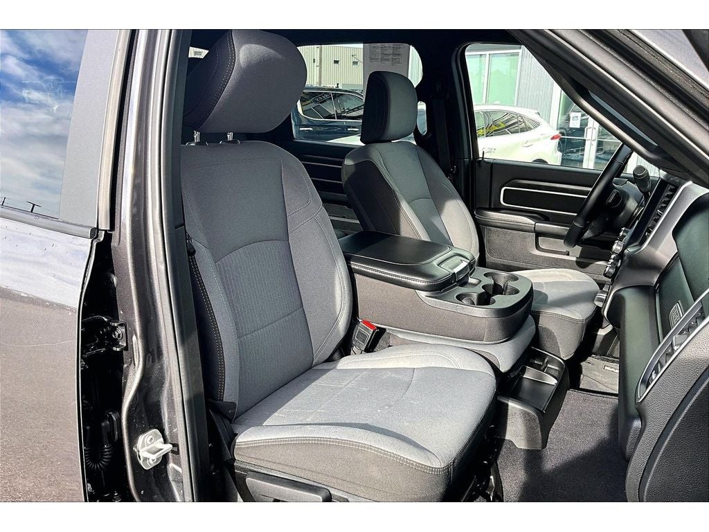 Quick Order Package 2HZ Big Horn. Level 1 Equipment Group: Google Android Auto; SiriusXM Radio Service; Bluetooth® Handsfree Phone and Audio; Integrated Center Stack Radio; For Details. Visit DriveUconnect.com; For More Info. Call 800-643-2112; Leather Wrapped Steering Wheel; Rear Dome with On/off Switch Lamp; Front Fog Lamps; Integrated Voice Command with Bluetooth®; Connectivity - US/Canada; Premium Cloth 40/20/40 Bench Seat; Glove Box Lamp; Auto Power-Folding Mirrors; Footwell Courtesy Lamp; 4G LTE Wi-Fi Hot Spot; GPS Antenna Input; Exterior Mirrors with Heating Element; Global Telematics Box Module; Mirror Running Lights; Uconnect 5 W Radio with 8.4" Display; 8.4" Touchscreen Display; Foam Bottle Insert (door Trim Panel); Black Exterior Mirrors; 18" X 8.0" Polished Aluminum Wheels; Apple CarPlay; Big Horn Instrument Panel Badge; Power Adjustable Convex Aux Mirrors; Forward and Reverse Utility Lights; Locking Lower Glove Box; Selectable Tire Fill Alert; SiriusXM Satellite Radio; Power Heated Fold Telescope Mirrors; Exterior Mirrors with Supplemental Signals; Steering Wheel Mounted Audio Controls; Exterior Mirrors Courtesy Lamps; Dual Glove Boxes; Center Hub; Power Adjust Mirrors; 2nd Row in Floor Storage Bins; Power Telescoping Mirrors. Quick Order Package 2GZ Big Horn. Premium Cloth 40/20/40 Bench Seat. Chrome Flat Cab-Length Side Steps. LT275/70R18E OWL On/off Road Tires. Granite Crystal Met CC. Front Fog Lamps. Tow Hooks. **Equipment listed is based on original vehicle build and subject to change. Please confirm the accuracy of the included equipment by calling the dealer prior to purchase.**